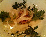 帆立の貝柱のグリルとゆでたそら豆とラルドのサラダを二人でシェア。