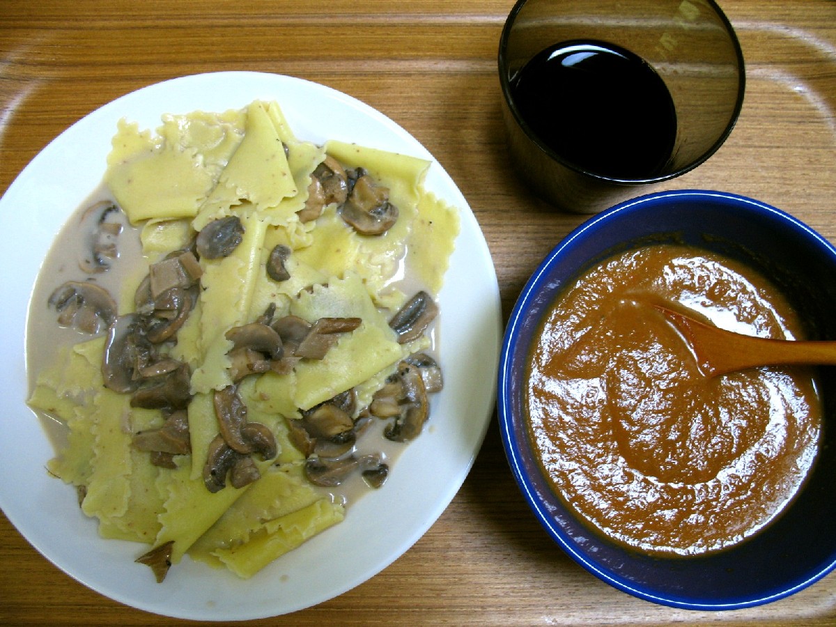 EATALYで買ったとうもろこし粉を使った薄くて平たいショートパスタを、オリーブオイルで炒めたブラウンマッシュルームに、乾燥ポルチーニ・ポルチーニブイヨン(イタリアにて購入したクノールのもの。とっくのとうに賞味期限切れ)・粉末ポルチーニでこれでもかと出したお出汁と豆乳を加えたソースで和えたもの。
